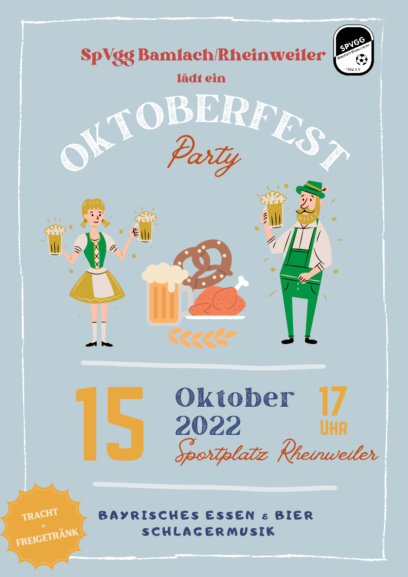 Am Samstag, den 15. Oktober veranstaltet die Spvgg. Bamlach/Rheinweiler auf dem Sportplatz im Kapellengrün Rheinweiler ein kleines Oktoberfest. Bewirtet werden die Gäste ab 17.00 Uhr während der Heimspiele der beiden Aktivmannschaften mit Hähnchen, Pommes, Würsten und einem Bierbrunnen. Der Verein freut sich auf zahlreiche Fans, Gäste und Zuschauer.